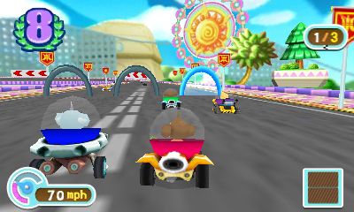 The other two modes feel like rushed afterthoughts. Monkey Race is a basic kart racer. It looks bland, the handling is off and it just makes you wish you were playing MARIO KART 7 instead. Then there's Monkey Fight, which tries to copy Super Smash Bros. but ends up a clunky button mashy mess. It's not fun at all and you'll probably try it once and never touch it again. It's a bummer because older SUPER MONKEY BALL games had a whole bunch of fun party games, and here we only get two, both of them pretty weak.